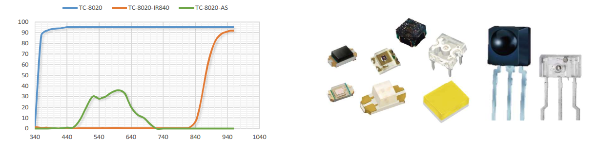 In order to improve the sensitivity of photosensors, such as ambient light sensor, IR receiver, and color sensor, we develop resins and pigments to achieve selective transmission or cut-off of different light wavelengths.